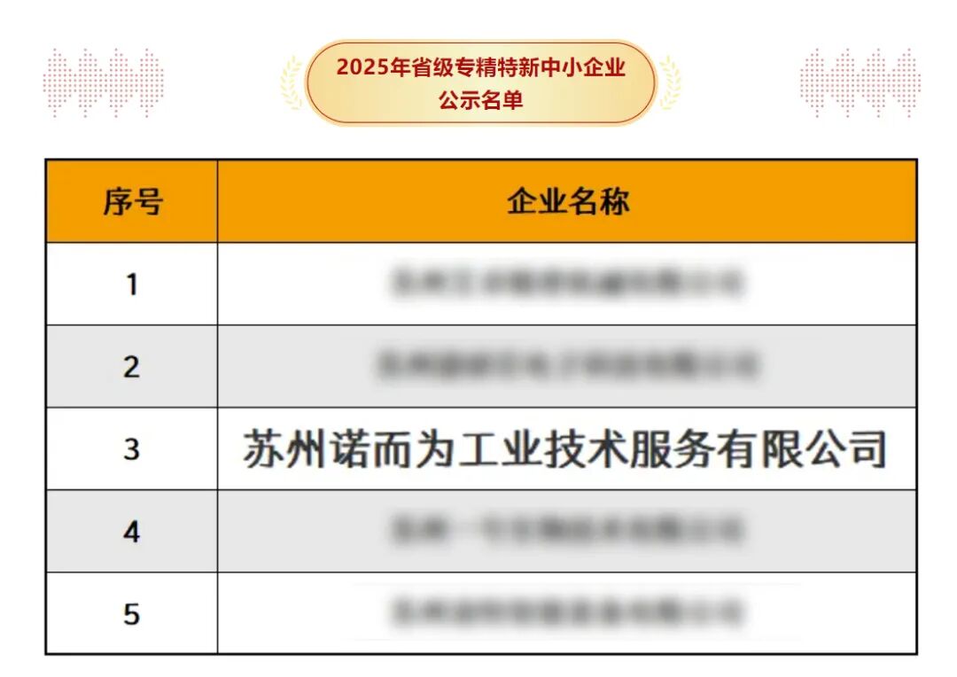 12月5日,江苏省工业和信息化厅公示了2025年度省级专精特新中小企业名单。苏州诺而为工业技术服务有限公司,榜上有名。